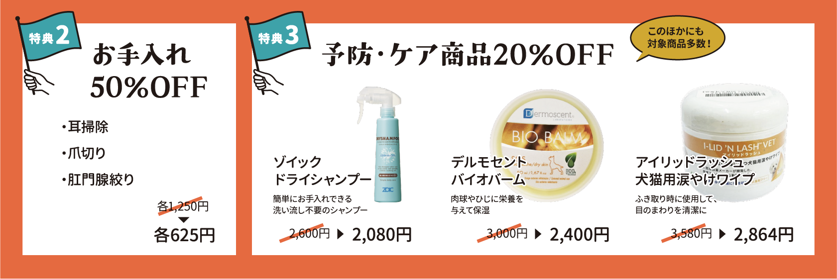 | 特典内容 | 【2】お手入れメニュー50%OFF 【3】予防・ケア商品全品20%OFF |