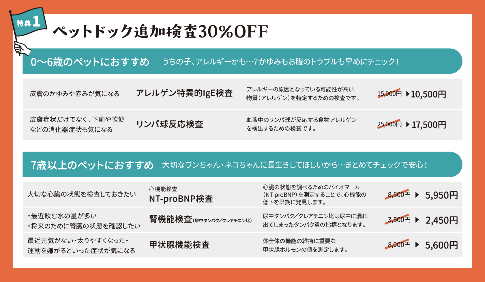 | 特典内容 | 【1】オプション検査30%OFF 《対象検査項目》アレルギー検査(アレルゲン特異的IgE検査、リンパ球反応検査)、心機能検査(NT-proBNP検査)、腎機能検査(尿中タンパク/クレアチニン比)、甲状腺機能検査、フィラリア検査 |